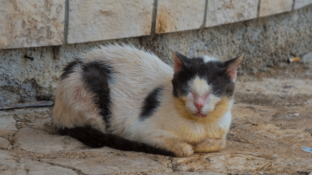 - Perut buncit walaupun badan kurus (terutama anak kucing).