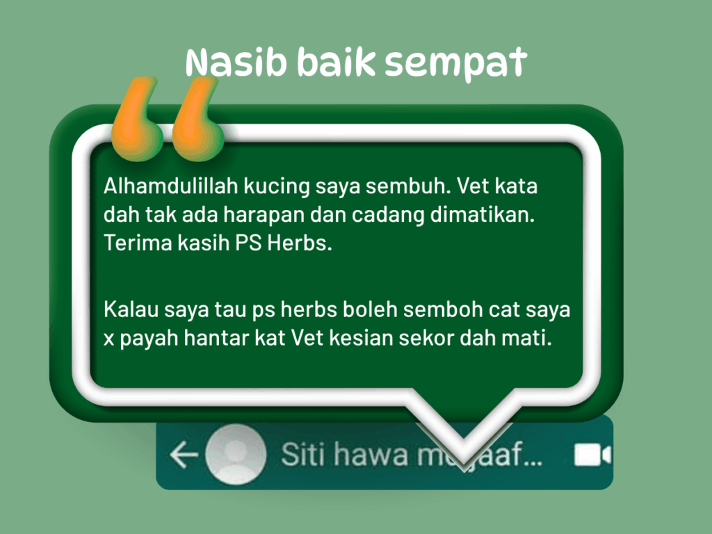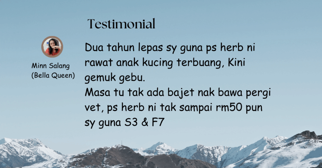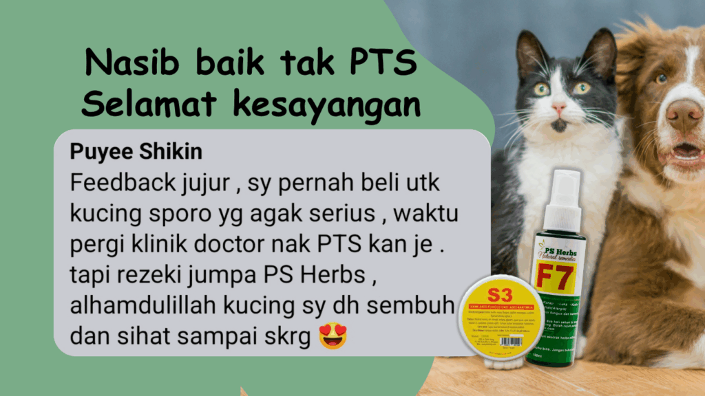 Beliau mula mencari rawatan alternatif, dan secara kebetulan terjumpa ubat Spray F7 keluaran PS Herbs. Alhamdulillah, selepas mencuba, kucingnya sembuh sepenuhnya. Inilah testimoni yang dikongsikan oleh beliau.