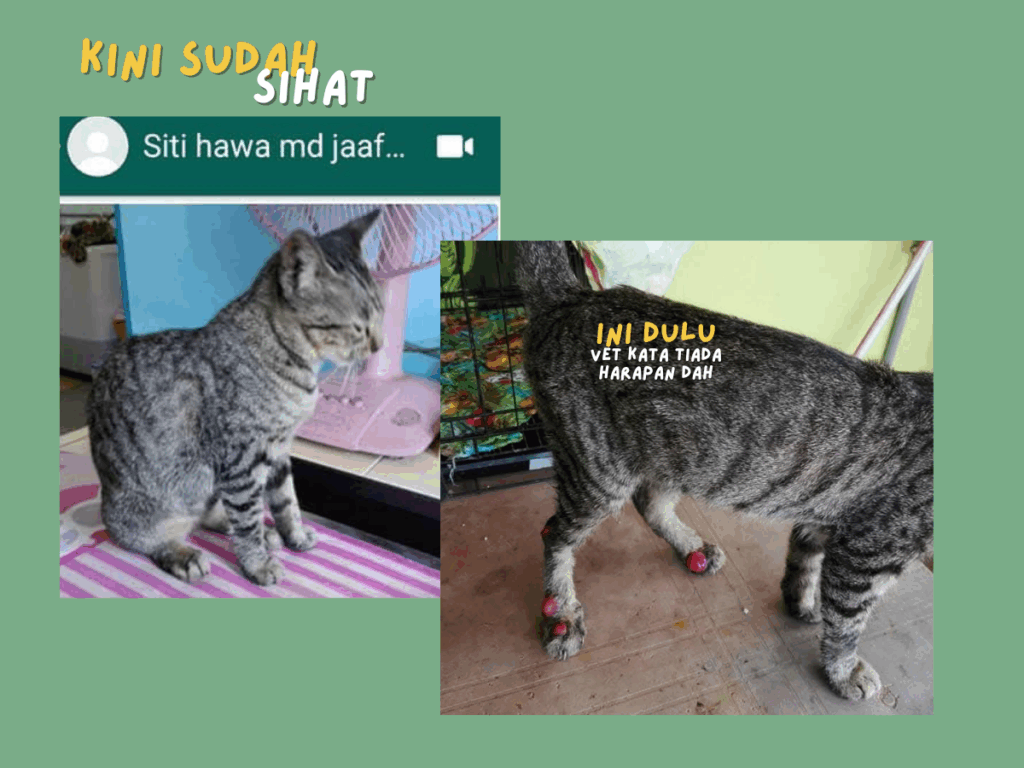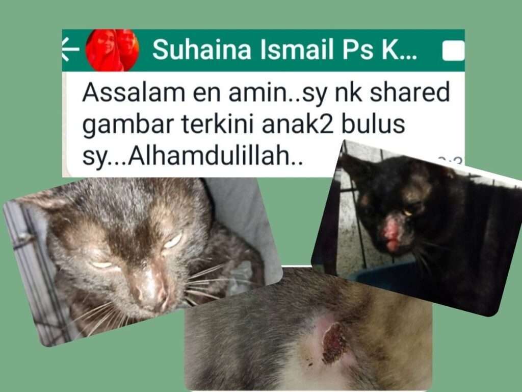 Beliau sangat teruja kerana beberapa hari sahaja sahaja kudis sporo sudah kering dan kira-kira sebulan kucingnya bebas daripada sporo. Beliau menghantar gambar-gambar testimoni merawat kucing sporo. Alhamdullillah.