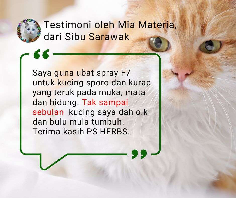 Kucing Mia terkena penyakit sporo dan kurap yang serius. Beliau cuba rawat dengan ubat PS Herbs, iaitu Spray F7 dan sebulan sahaja beliau melaporkan bahawa kucingnya sudah sembuh.