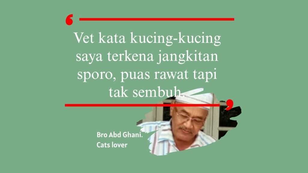Saudara Abd Ghani kami bahawa vet kata kucingnya terkena jangkitan sporo. Sudah lama cuba rawat tetapi tidak juga sembuh.